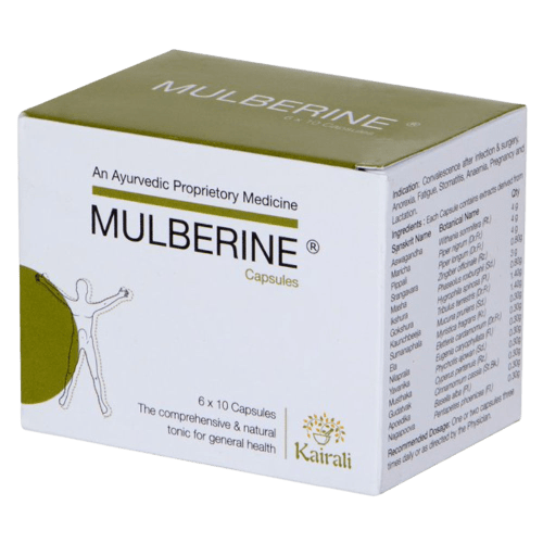 Kairali’s Mulberine capsule is an effective Ayurvedic medicine for good health formulated with a unique blend of herbs that has essential vitamins, minerals and anti-oxidants. It is a 100% natural Ayurvedic solution to your nutritional requirements that improves immunity, stamina, strength, vigour, vitality and overall health.